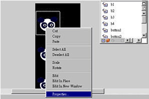 選擇按鈕 然後, 你選取熊貓按鈕,點擊滑鼠右按鈕,移動你的滑鼠向下到項目列上的Properties。