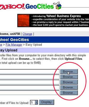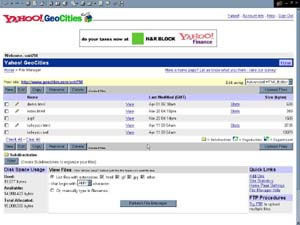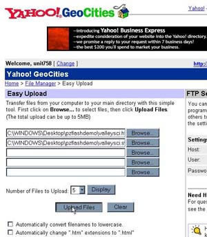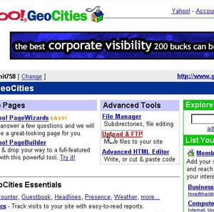 Yahoo! Geocites 提供用戶優秀的瀏覽器為基礎的檔案傳輸協定(FTP)的實用程序。我們會討論怎樣使用此實用程序去上傳你的 Flash 動畫。 讓我們在Yahoo! Geocities Home Page 開始