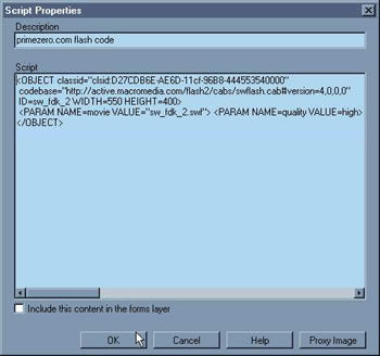 - 在 SCRIPT 欄中,複製及貼上你的 Flash HTML 碼。或者複製及貼上此導修課以下原始碼。